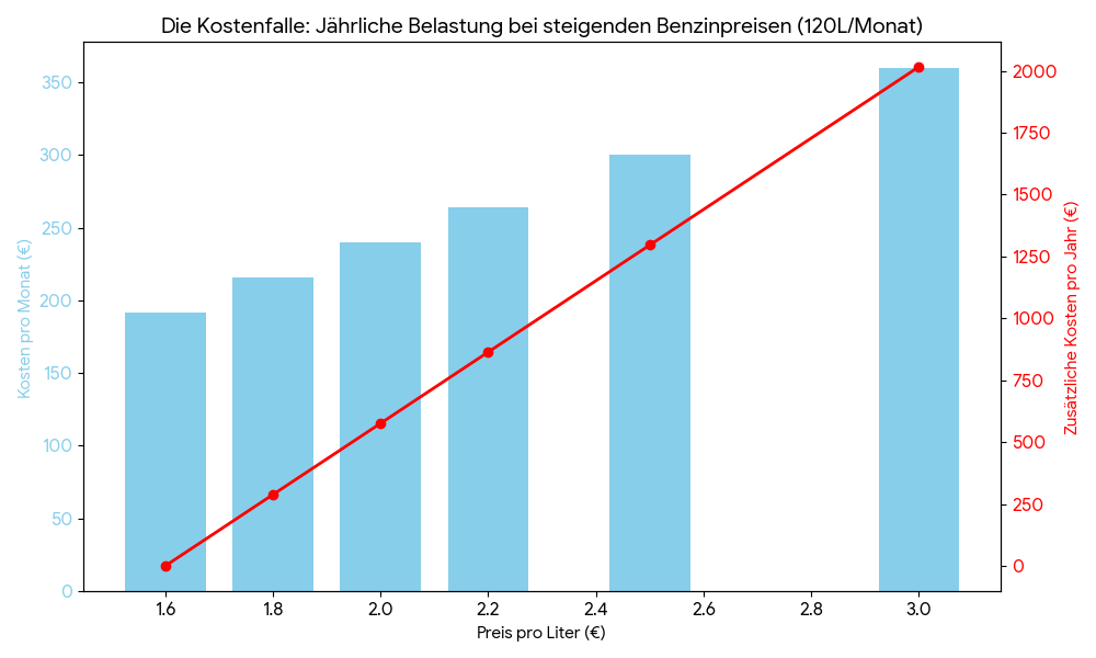 - Der schleichende Ruin: Wer 120 Liter im Monat tankt (2 Tankfüllungen), zahlt bei einem Preissprung von 1,60 € auf 2,50 € zwar „nur“ 108 € mehr im Monat. Doch die wahre Zahl steht in der Jahresspalte: 1.296 € Mehrkosten pro Jahr. Das ist praktisch der Jahresurlaub.